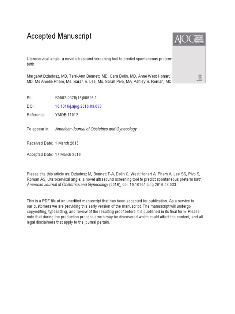 Roman AS, Uterocervical angle: a novel ultrasound screening tool to predict spontaneous preterm birth,
