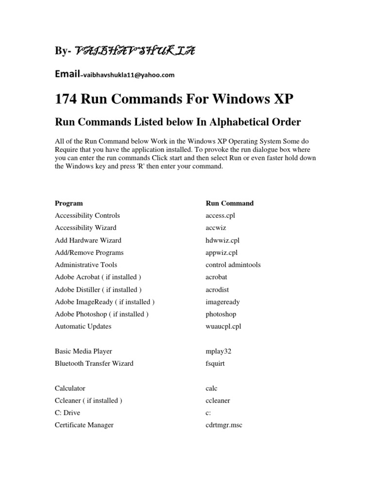 All of the Run Command below Work in the Windows XP Operating System Some do
