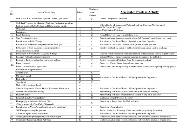 Name of the Activity Points Points Acceptable Proofs of Activity