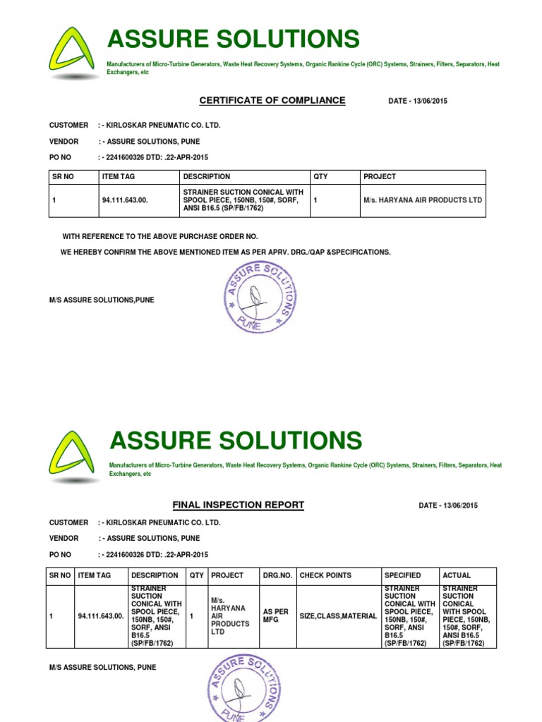 CUSTOMER : - KIRLOSKAR PNEUMATIC CO. LTD.