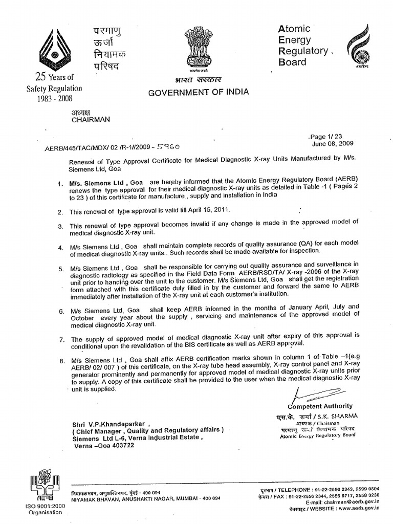 Mis. Siemens Ltd , Goa are hereby informed that the Atomic Energy Regulatory Board (AERB)
