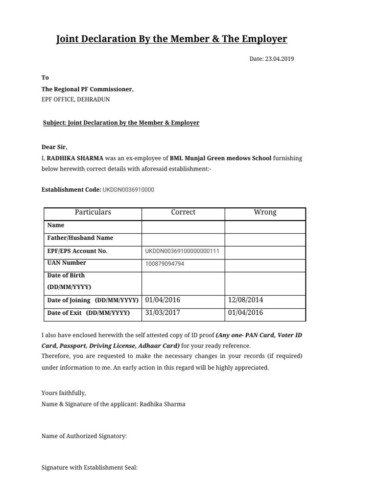Subject: Joint Declaration by the Member & Employer