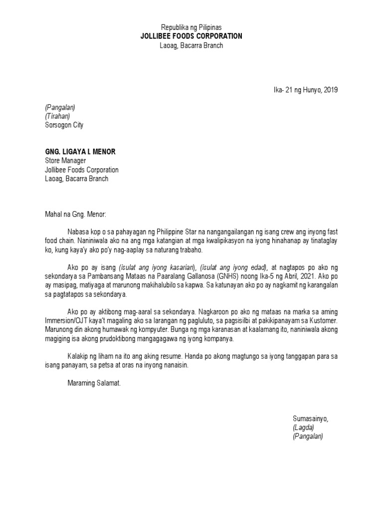 ko, kung kaya’y ako po’y nag-aaplay sa naturang trabaho.
