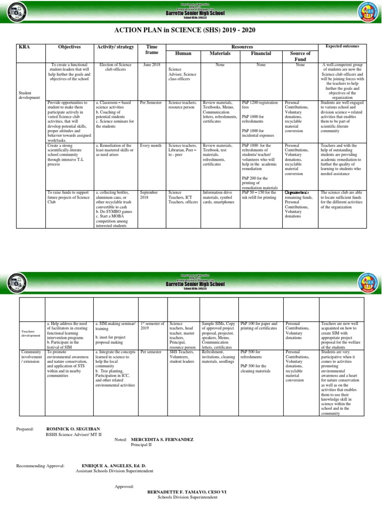 ACTION PLAN in SCIENCE (SHS) 2019 - 2020