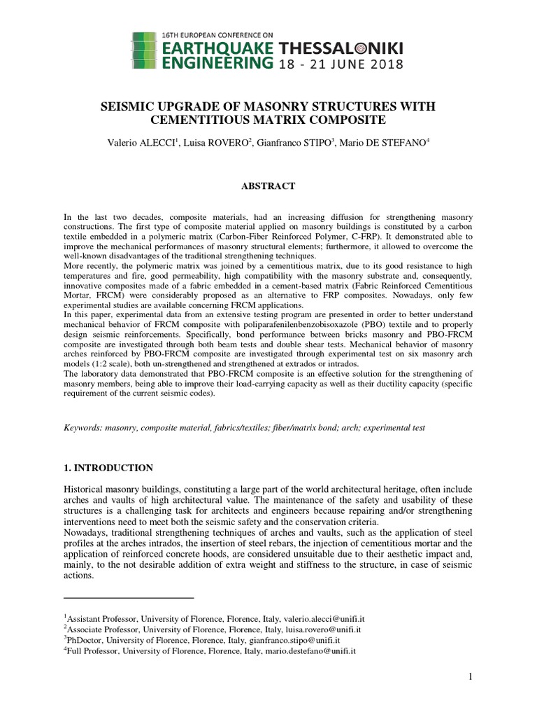 Alecci V, Focacci F, Rovero L, Stipo G, De Stefano M (2016). Extrados strengthening of brick masonry arches