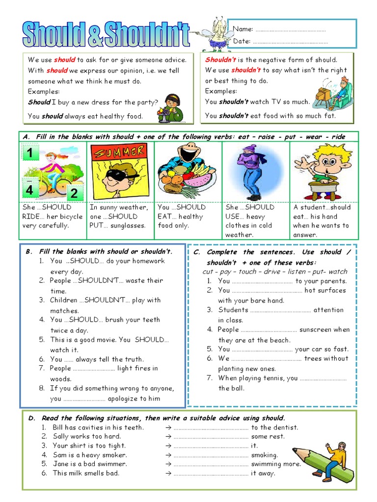 A. Fill in the blanks with should + one of the following verbs: eat – raise - put - wear - ride