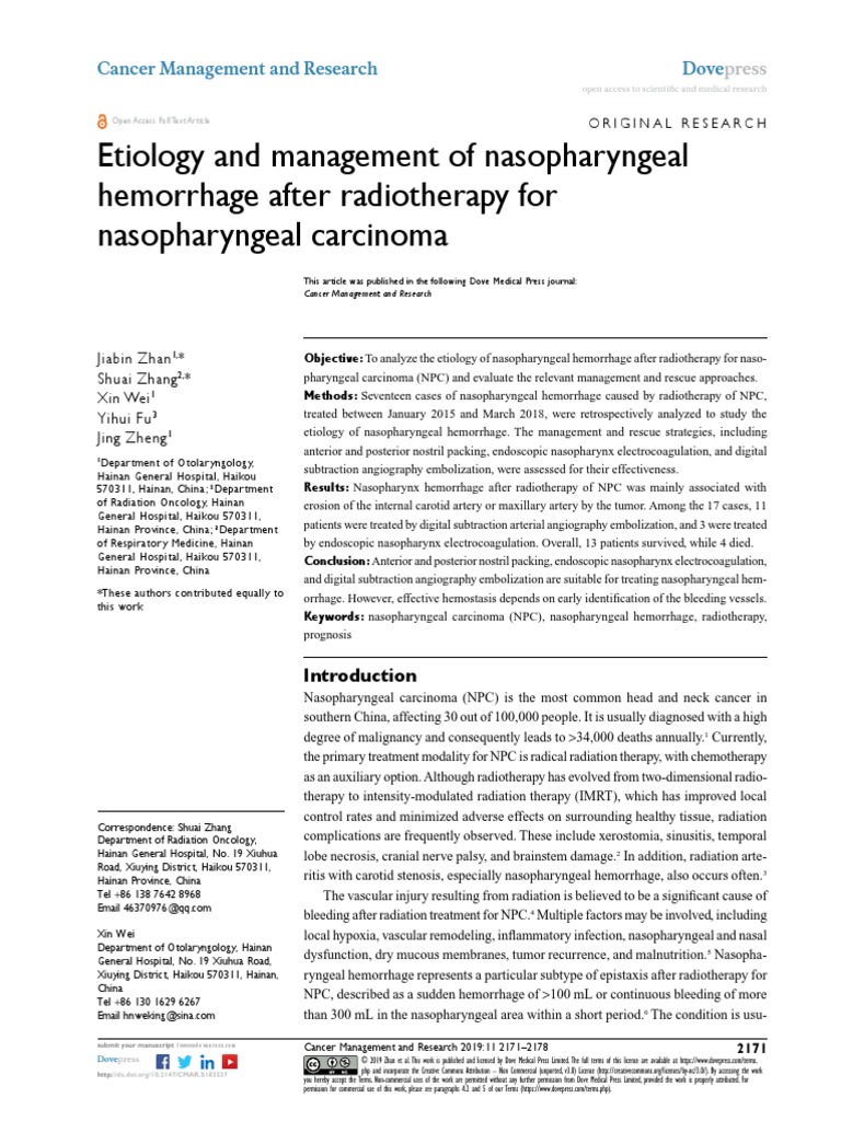 Jiabin Zhan 1,* Objective: To analyze the etiology of nasopharyngeal hemorrhage after radiotherapy for naso-