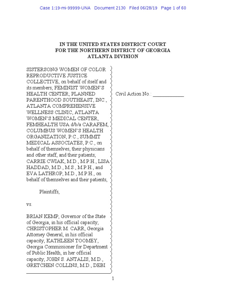 Full filing in SisterSong v. Kemp, filed 6/28/19