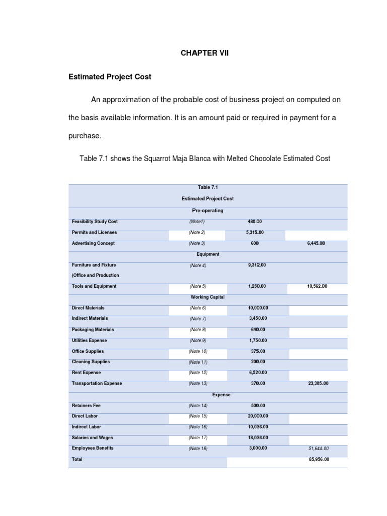 Table 7.1 shows the Squarrot Maja Blanca with Melted Chocolate Estimated Cost