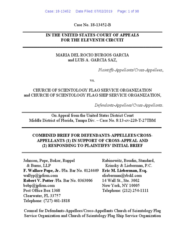 In accordance with Federal Rule of Appellate Procedure 26.1 and Eleventh Circuit Rule 26.1-2(c), Appellees/Cross-Appellants make the following corporate disclosure: 1. The Church of Scientology Flag Service Organization, Inc., Appellee, is not publicly traded, and has no parent company or subsidiaries. 2. The Church of Scientology Flag Ship Service Organization, Inc., Appellee, is not publicly traded, and has no parent company or subsidiaries. In compliance with Fed. R. App. P. 26.1, 11th Cir. R. 26.1-1, 11th Cir. R. 26.1-2(a), and 11th Cir. R. 26.1-3, the undersigned hereby certifies that the following persons and entities have an interest in the outcome of this case: 1. Burlington & Rockenbach, P.A. – Counsel for Appellants 2. Burlington, Philip M. – Counsel for Appellants 3. The Church of Scientology Flag Service Organization, Inc., Clearwater, Florida, Appellee 4. The Church of Scientology Flag Ship Service Organization, Inc., Clearwater, Florida, Appellee 5. Deixler, Bert H. – Appellees’ Counsel 6. Garcia, Maria Del Rocio Burgos – Appellant 7. Johnson, Pope, Bokor, Ruppel & Burns, LLP – Appellee’s Counsel 8. Johnson, Robert E. – Appellants’ Counsel