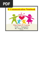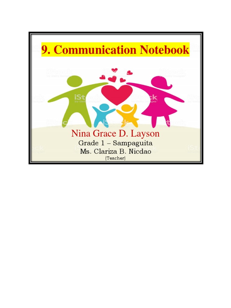 The document is a communication notebook for a Grade 1 student named Nina Grace D. Layson from Sampaguita class, with her teacher listed as Ms. Clariza B. Nicdao. It serves as a way for the teacher and parents/guardians of Nina Grace to communicate about her schoolwork, progress, or any other notes.