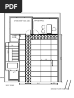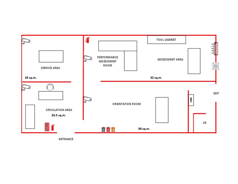 This floor plan shows a workshop space divided into several areas including a tool cabinet, performance assessment area, service area, orientation room with a sink, and circulation area leading to an exit. The total floor area is approximately 110 square meters split between the different function-specific rooms and circulation space.