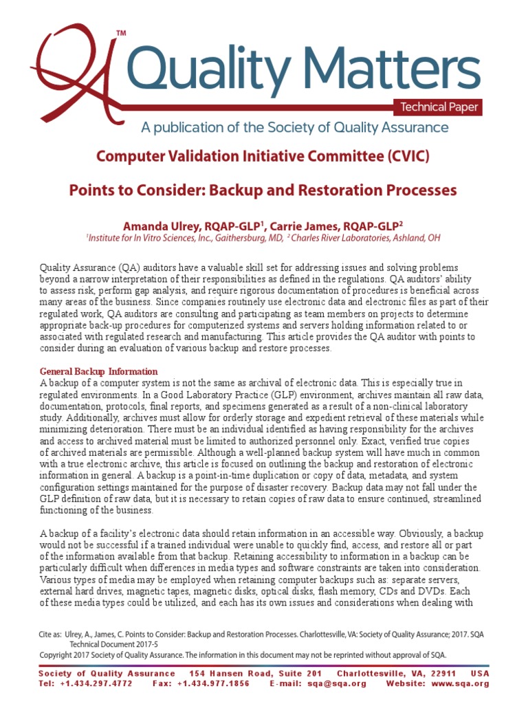 Cite as: Ulrey, A., James, C. Points to Consider: Backup and Restoration Processes. Charlottesville, VA: Society of Quality Assurance; 2017. SQA