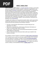 SWOT is an short form of Strengths, Weaknesses, Opportunities and Threats. By definition,