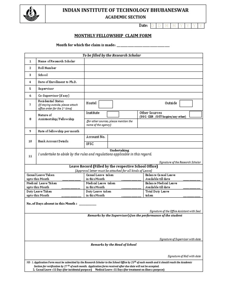 NB: 1. Application Form must be submitted by the Research Scholar to the School Office by 25th of each month and it should reach the Academic