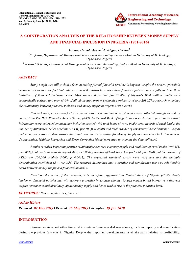 are inadequate studies on the effect of money supply on monetary inclusion. To make this research more indicative and