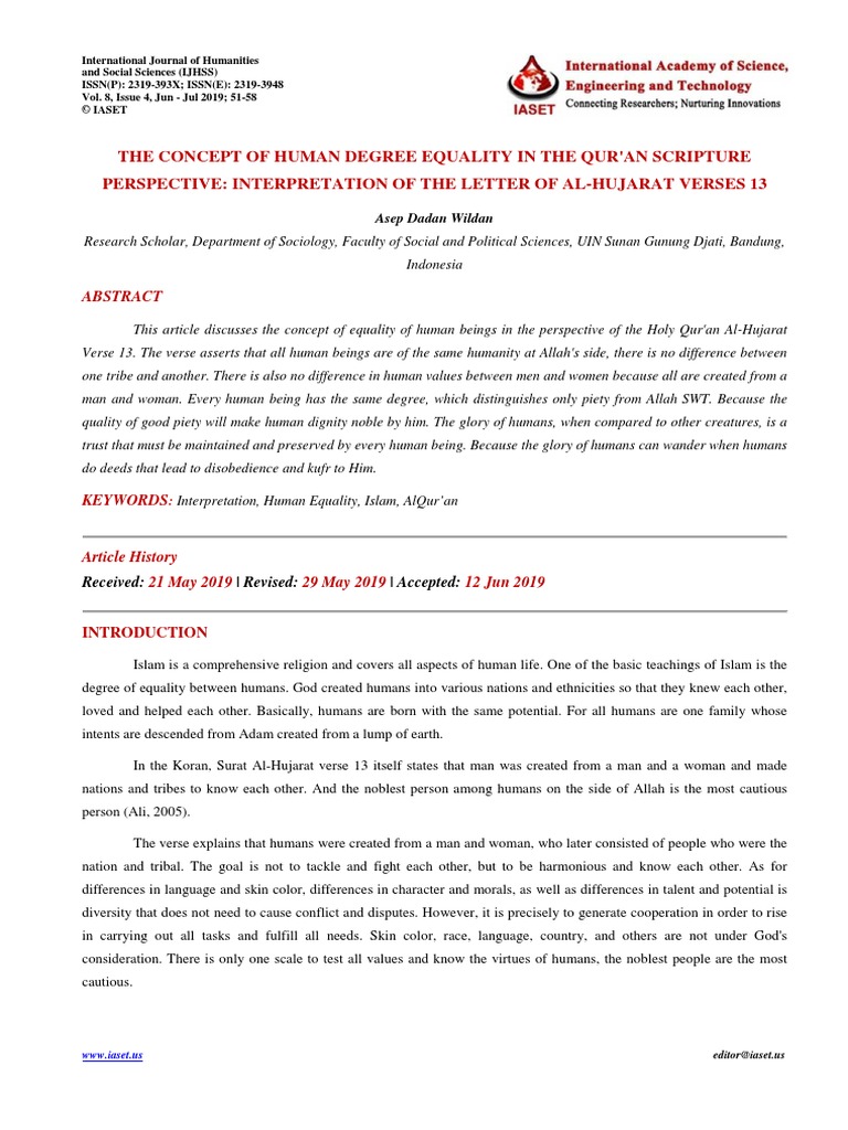 This article discusses the concept of equality of human beings in the perspective of the Holy Qur'an Al-Hujarat