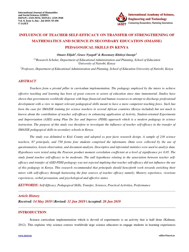 Although the study was entitled “influence of teacher self-efficacy in the transfer of SMASSE pedagogy in a