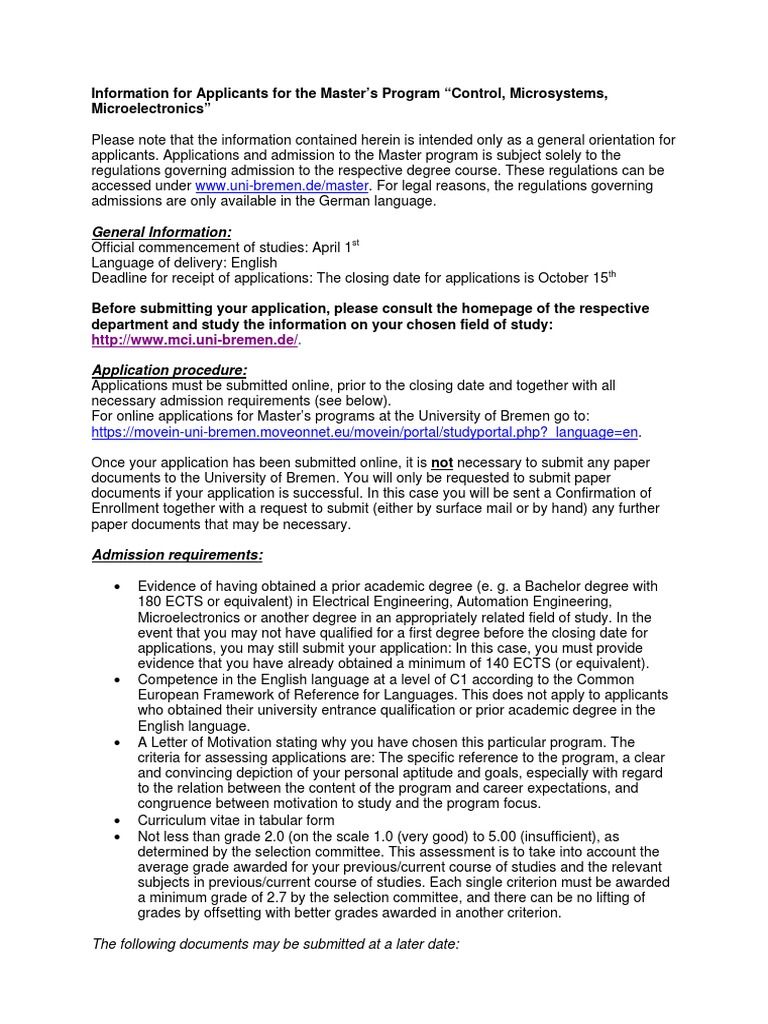 Information for Applicants for the Master’s Program “Control, Microsystems,