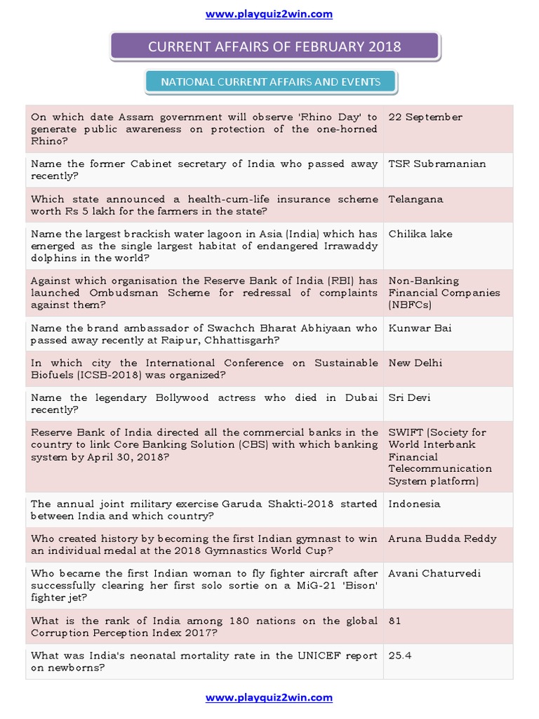 CURRENT AFFAIRS OF FEBRUARY 2018