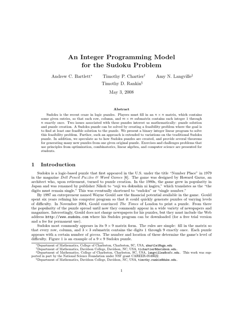 Let us mathematically model the Sudoku puzzle found in Figure 1 as a linear program. More specifically,