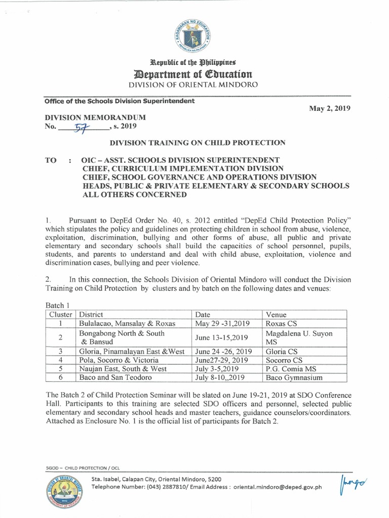 1, Pursuant to DepEd Order No. 40, s. 2012 entitled “DepEd Child Protection Policy”