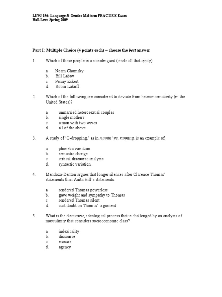 LING 156: Language & Gender Midterm PRACTICE Exam