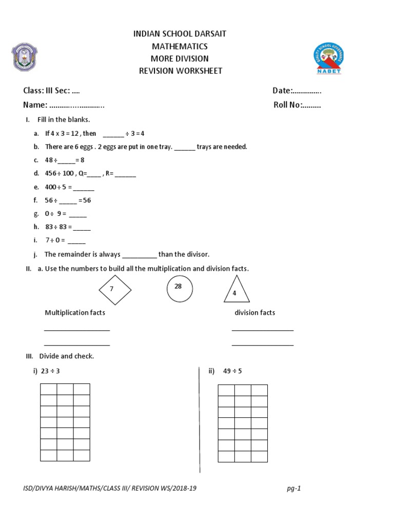 ISD/DIVYA HARISH/MATHS/CLASS III/ REVISION WS/2018-19 pg-1