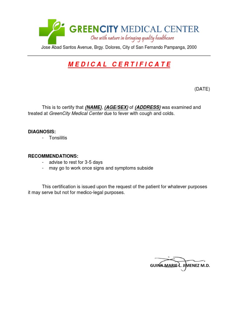 This is to certify that (NAME), (AGE/SEX) of (ADDRESS) was examined and