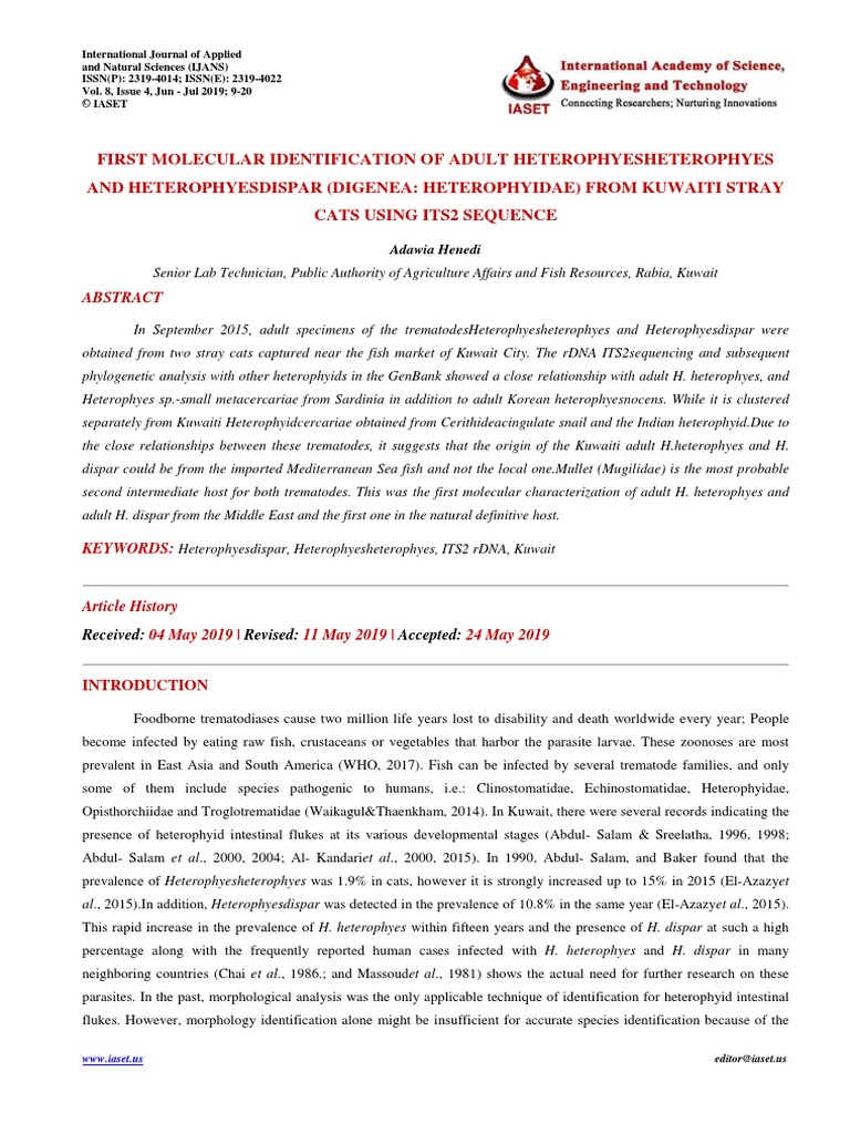 parasites. In the past, morphological analysis was the only applicable technique of identification for heterophyid intestinal