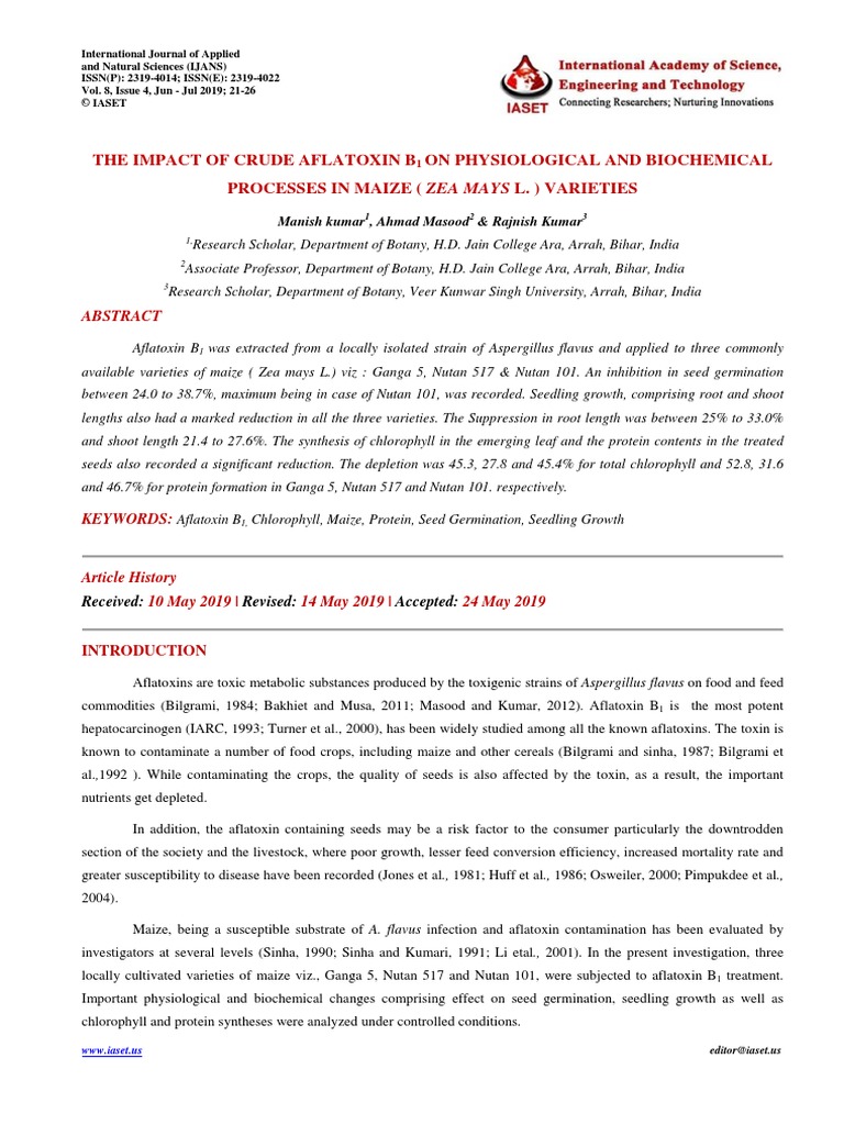 17. Sinha K.K. & Kumari P. (1991). Incidence of aflatoxins in maize and its impact on physiological processes of