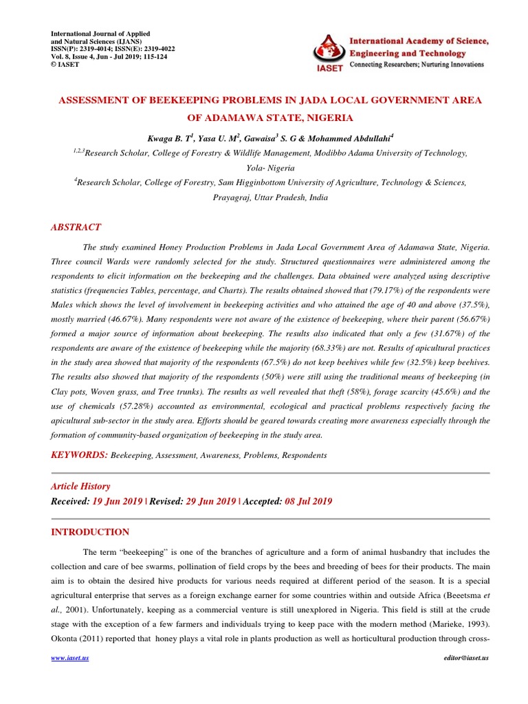 The study examined Honey Production Problems in Jada Local Government Area of Adamawa State, Nigeria.