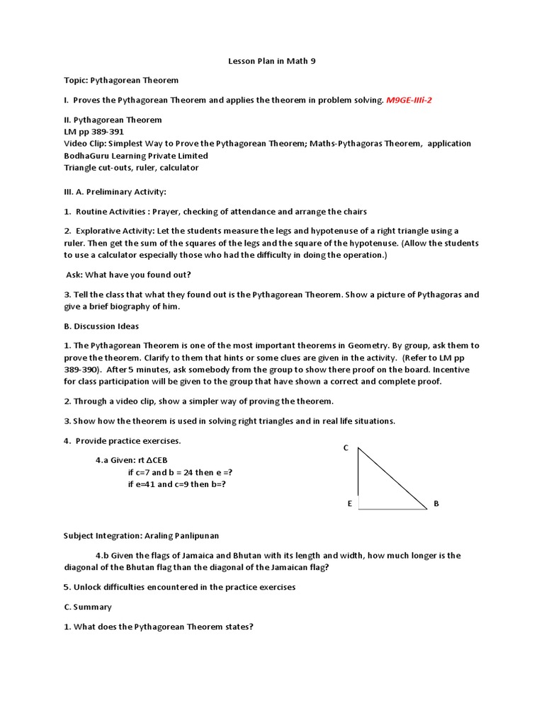 I. Proves the Pythagorean Theorem and applies the theorem in problem solving. M9GE-IIIi-2