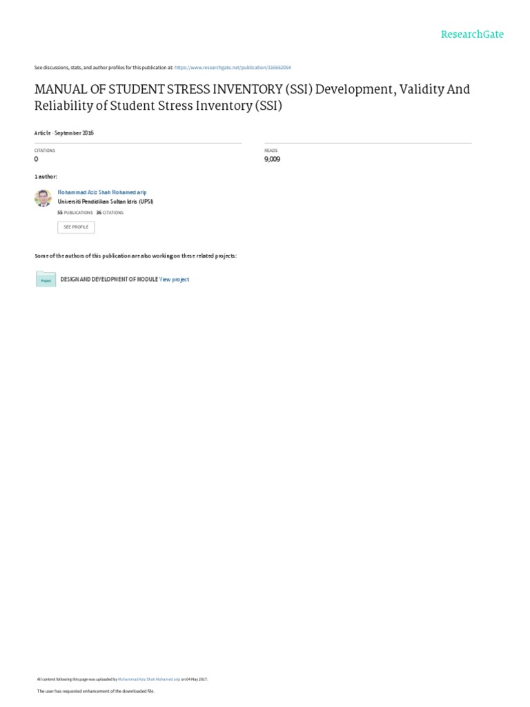 MANUAL OF STUDENT STRESS INVENTORY (SSI) Development, Validity And