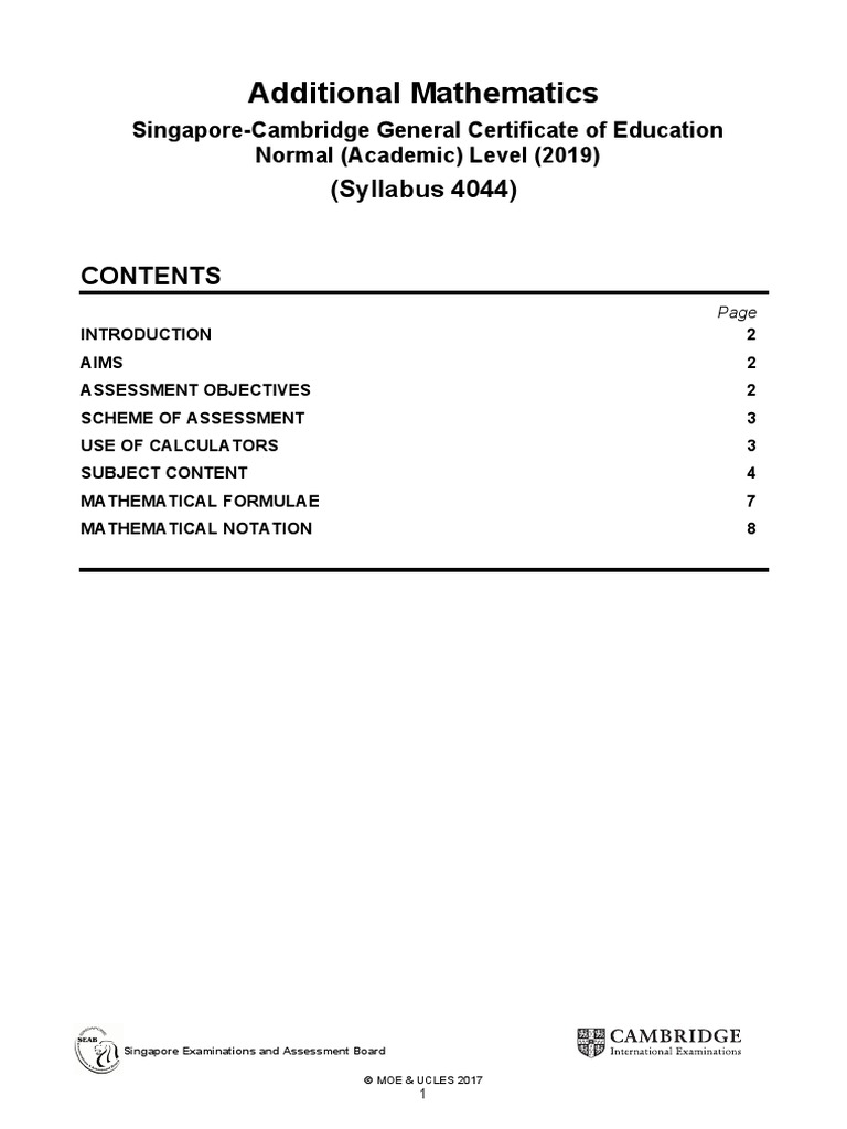4044 ADDITIONAL MATHEMATICS GCE NORMAL (ACADEMIC) LEVEL SYLLABUS (2019)