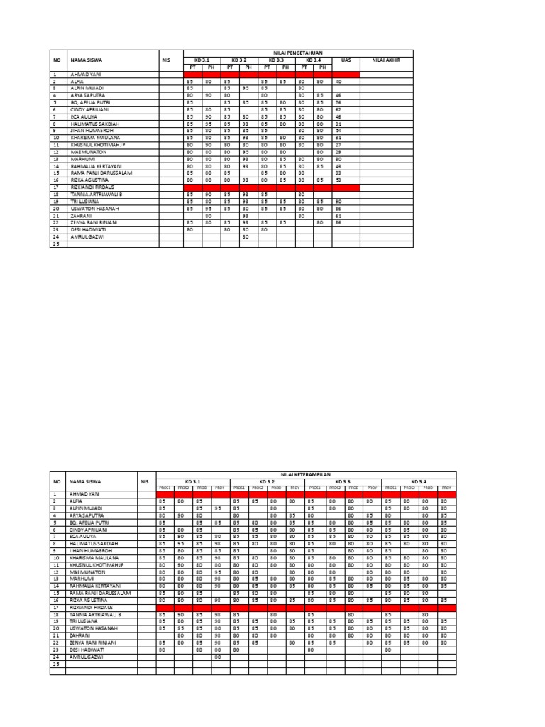 NO NAMA SISWA NIS KD 3.1 KD 3.2 KD 3.3 KD 3.4 UAS NILAI AKHIR