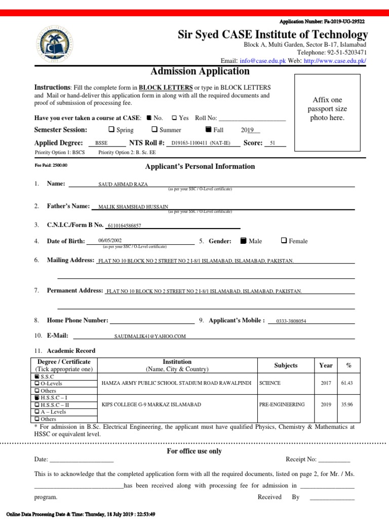 SS-CASE-IT, Block A, Multi Garden, Sector B-17, Islamabad during office hours of 08:00 AM till 04:00