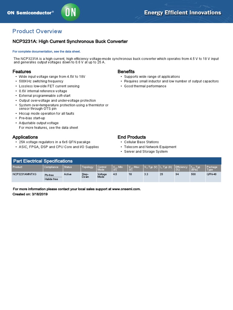 The NCP3231A is a high current, high efficiency voltage-mode synchronous buck converter which operates from 4.5 V to 18 V input