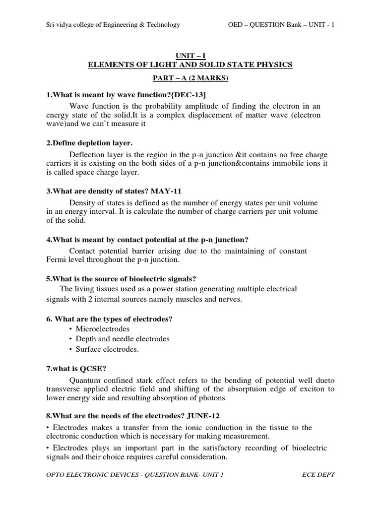 OPTO ELECTRONIC DEVICES - QUESTION BANK- UNIT 1 ECE DEPT