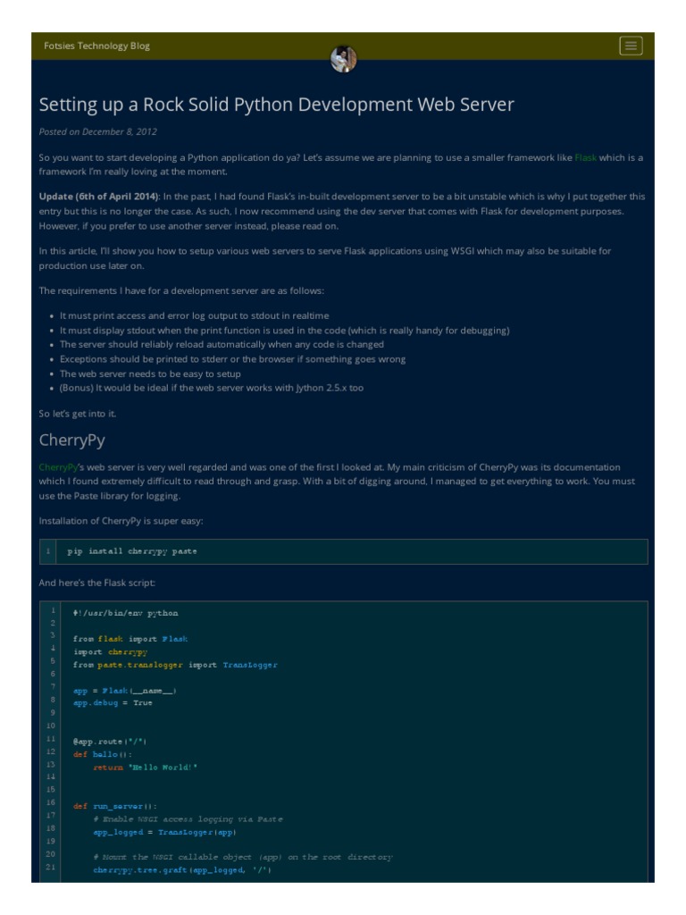 CherryPy’s web server is very well regarded and was one of the rst I looked at. My main criticism of CherryPy was its documentation