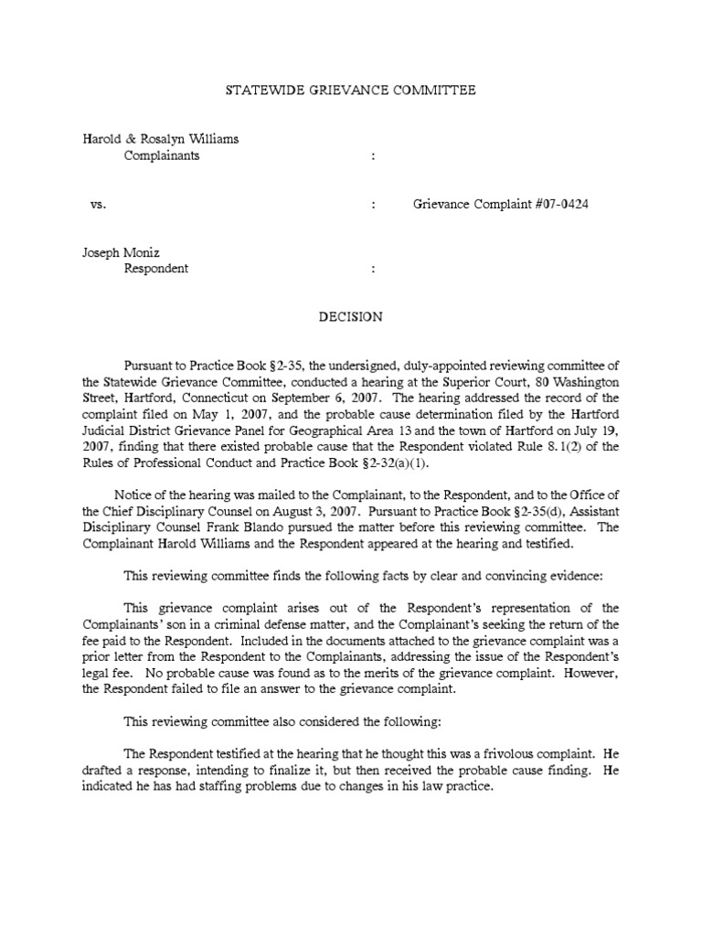 A Grievance Complaint was filed against a law firm representing a family member. The responding firm, Joseph moniz, failed to file an answer to the Grievance Complaint. This reviewing commit…