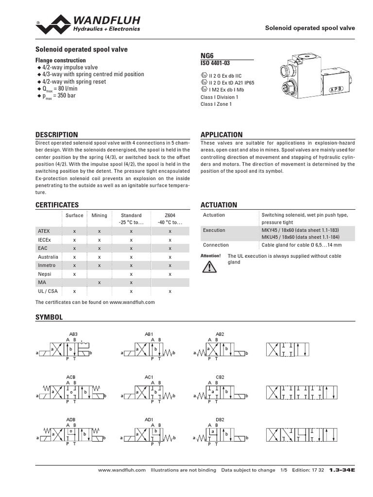 Direct operated solenoid spool valve with 4 connections in 5 cham- These valves are suitable for applications in explosion-hazard