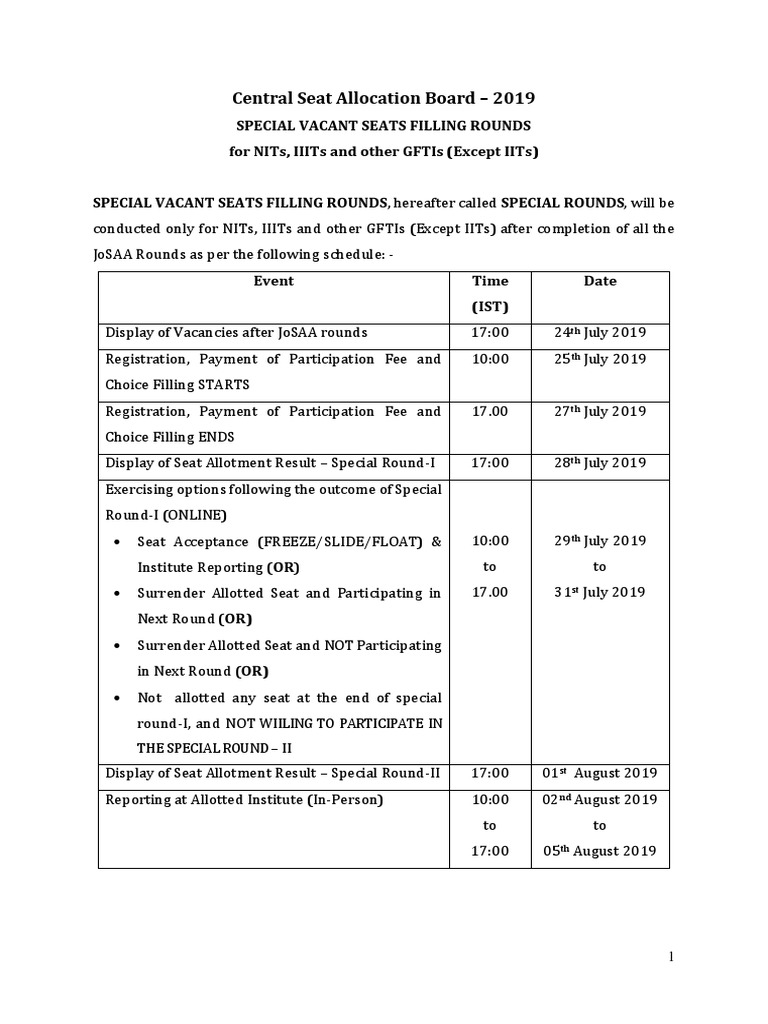 for participating in the SPECIAL ROUNDS as per JoSAA 2019 / CSAB 2019 rules.