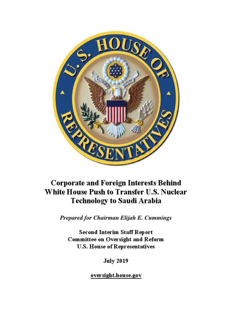 On February 19, 2019, the Committee on Oversight and Reform issued an interim staff report prepared for Chairman Elijah E. Cummings after multiple whistleblowers came forward to warn about efforts inside the White House to rush the transfer of U.S. nuclear technology to Saudi Arabia. As explained in the first interim staff report, under Section 123 of the Atomic Energy Act, the United States may not transfer nuclear technology to a foreign country without the approval of Congress in order to ensure that the agreement meets nine nonproliferation requirements to prevent the spread of nuclear weapons. These agreements, commonly known as “123 Agreements,” are typically negotiated with career experts at the National Security Council (NSC) and the Departments of State, Defense, and Energy. The “Gold Standard” for 123 Agreements is a commitment by the foreign country not to enrich or re-process nuclear fuel and not to engage in activities linked to the risk of nuclear proliferation. During the Obama Administration, Saudi Arabia refused to agree to the Gold Standard. During the Trump Administration, Saudi Crown Prince Mohammed bin Salman (MBS) went further, proclaiming: “Without a doubt, if Iran developed a nuclear bomb, we will follow suit as soon as possible.” There is strong bipartisan opposition to abandoning the “Gold Standard” for Saudi Arabia in any future 123 Agreement. For example, in a letter to President Trump, Republican Senators Marco Rubio, Todd Young, Cory Gardner, Rand Paul, and Dean Heller wrote: Given your Administration’s ongoing efforts to press the Iranian regime—in the words of Secretary of State Mike Pompeo—to “stop enrichment and never pursue plutonium reprocessing,” we have long believed that it is therefore critical and necessary for the Kingdom of Saudi Arabia to accept and uphold this “Gold Standard” for responsible nuclear behavior. The Committee’s first interim staff report explained that whistleblowers inside the White House expressed alarm about corporate interests attempting to use their influence with the Trump Administration to bypass these concerns in order to serve their own financial interests in building nuclear reactors in Saudi Arabia. The Committee received documents bolstering the whistleblowers’ accounts and showing frequent communications between these corporate interests and Trump Administration officials. This report—the Committee’s second interim staff report on this issue—is based on more than 60,000 pages of new documents obtained by the Committee since it issued its first interim staff report in February. These documents have been produced in response to requests that Chairman Cummings made to a host of outside companies about their involvement with these efforts.
