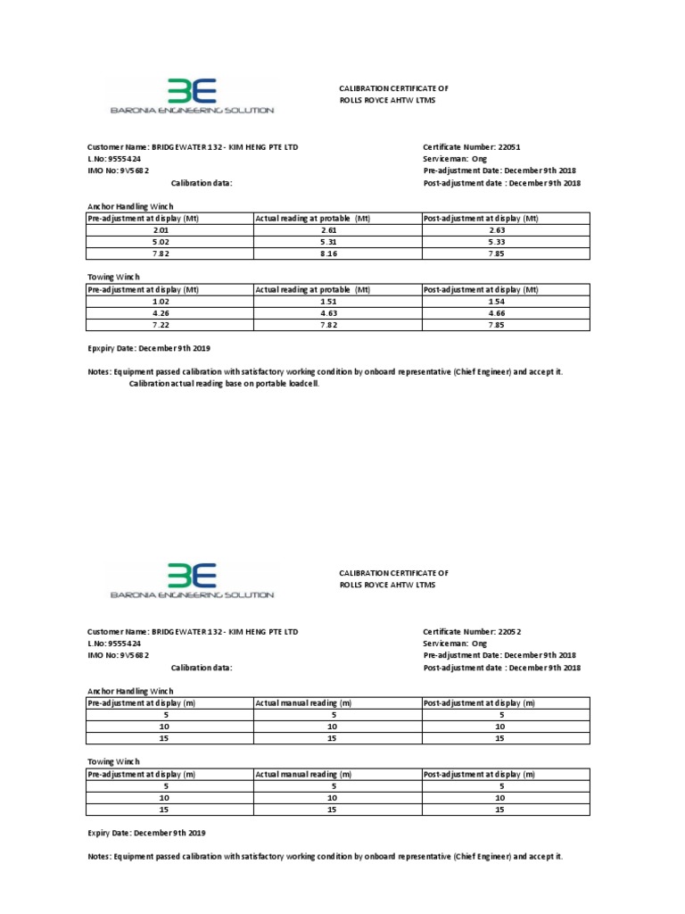 Notes: Equipment passed calibration with satisfactory working condition by onboard representative (Chief Engineer) and accept it.