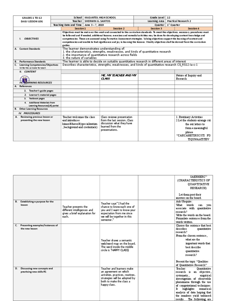 DAILY LESSON LOG Teacher SHERWIN G. SANTOS Learning Area Practical Research 2