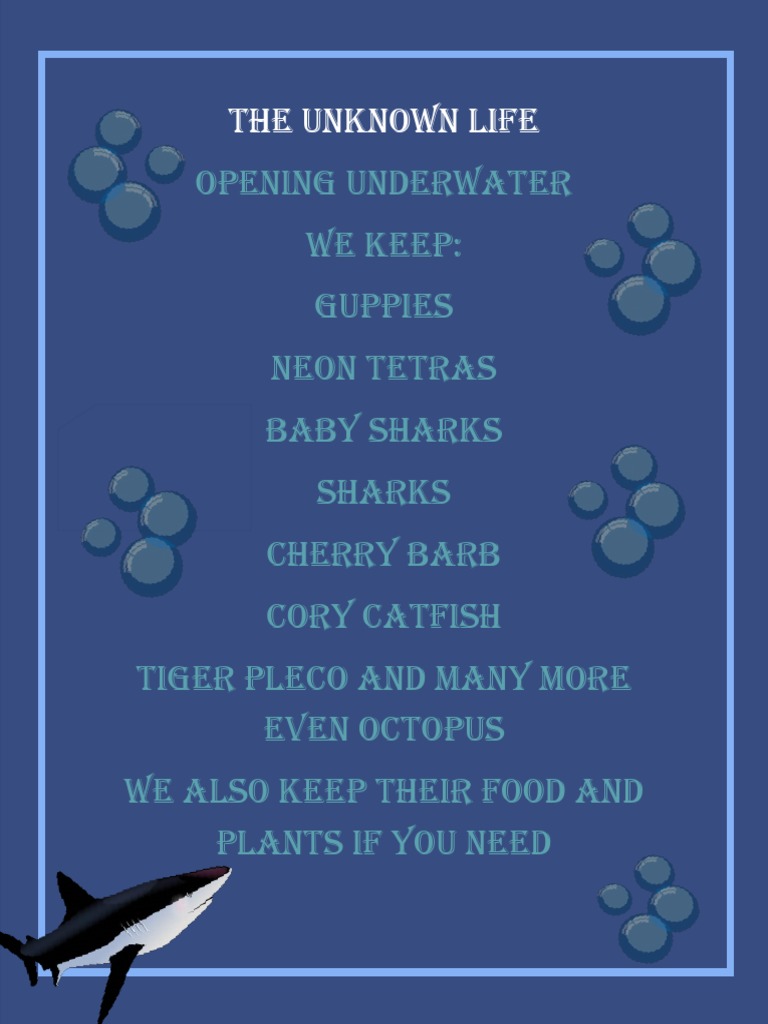 Opening underwater We keep: Guppies Neon tetras Baby sharks Sharks Cherry barb Cory catfish Tiger pleco and many more even octopus We also keep their food and plants if you need