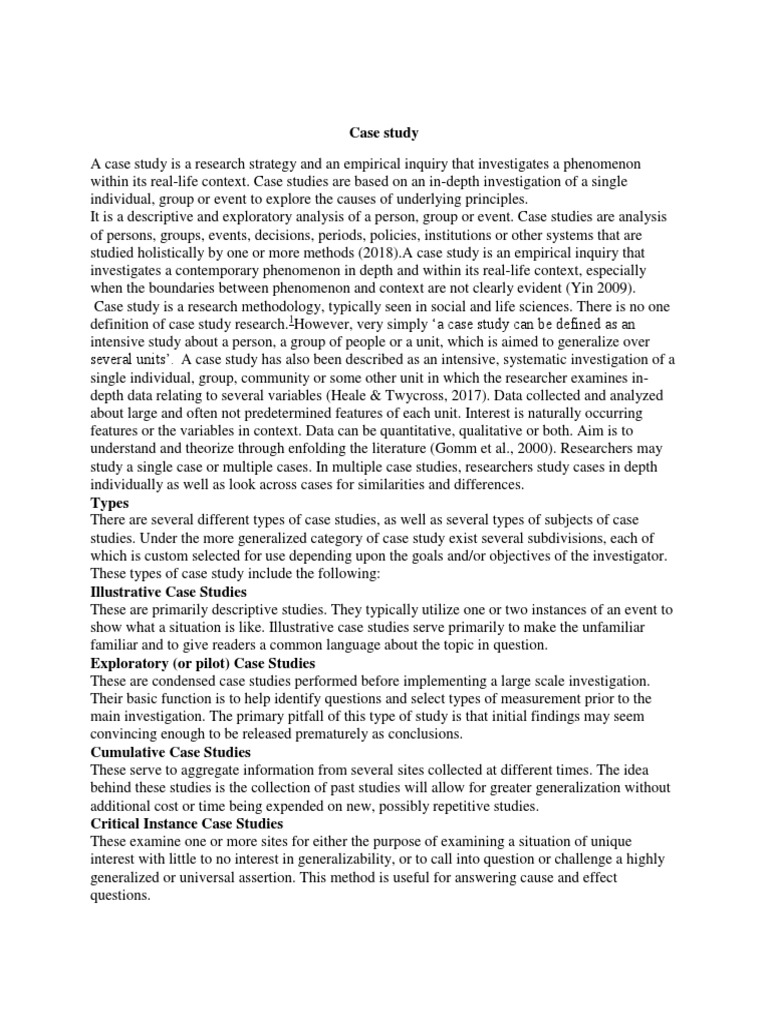 studied holistically by one or more methods (2018).A case study is an empirical inquiry that