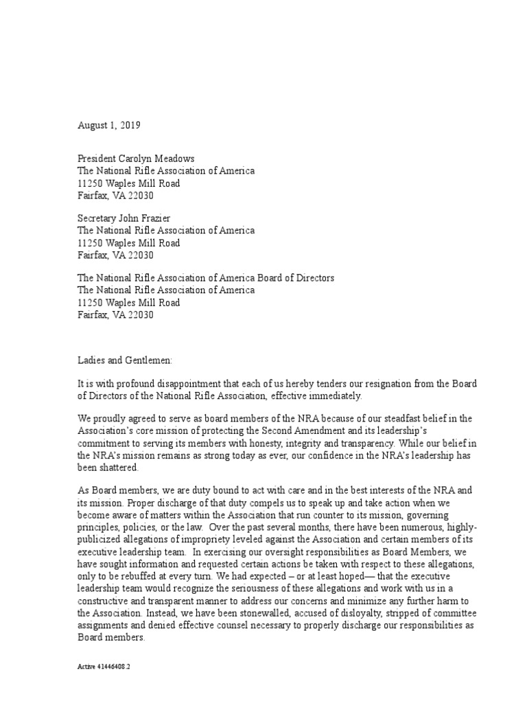 August 1, 2019President Carolyn MeadowsThe National Rifle Association of America11250 Waples Mill RoadFairfax, VA 22030Secretary John Frazier The National Rifle Association of America11250 Waples Mill RoadFairfax, VA 22030The National Rifle Association of America Board of DirectorsThe National Rifle Association of America11250 Waples Mill RoadFairfax, VA 22030Ladies and Gentlemen:It is with profound disappointment that each of us hereby tenders our resignation from the Board of Directors of the National Rifle Association, effective immediately.We proudly agreed to serve as board members of the NRA because of our steadfast belief in the Association’s core mission of protecting the Second Amendment and its leadership’s commitment to serving its members with honesty, integrity and transparency. While our belief in the NRA’s mission remains as strong today as ever, our confidence in the NRA’s leadership has been shattered. As Board members, we are duty bound to act with care and in the best interests of the NRA and its mission. Proper discharge of that duty compels us to speak up and take action when we become aware of matters within the Association that run counter to its mission, governing principles, policies, or the law. Over the past several months, there have been numerous, highly- publicized allegations of impropriety leveled against the Association and certain members of its executive leadership team. In exercising our oversight responsibilities as Board Members, we have sought information and requested certain actions be taken with respect to these allegations, only to be rebuffed at every turn. We had expected – or at least hoped— that the executive leadership team would recognize the seriousness of these allegations and work with us in a constructive and transparent manner to address our concerns and minimize any further harm to the Association. Instead, we have been stonewalled, accused of disloyalty, stripped of committee assignments and denied effective counsel necessary to properly discharge our responsibilities as Board members.