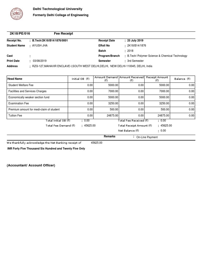 Receipt No. : B.Tech/2K18/B14/1876/0001 Receipt Date : 25 July 2019